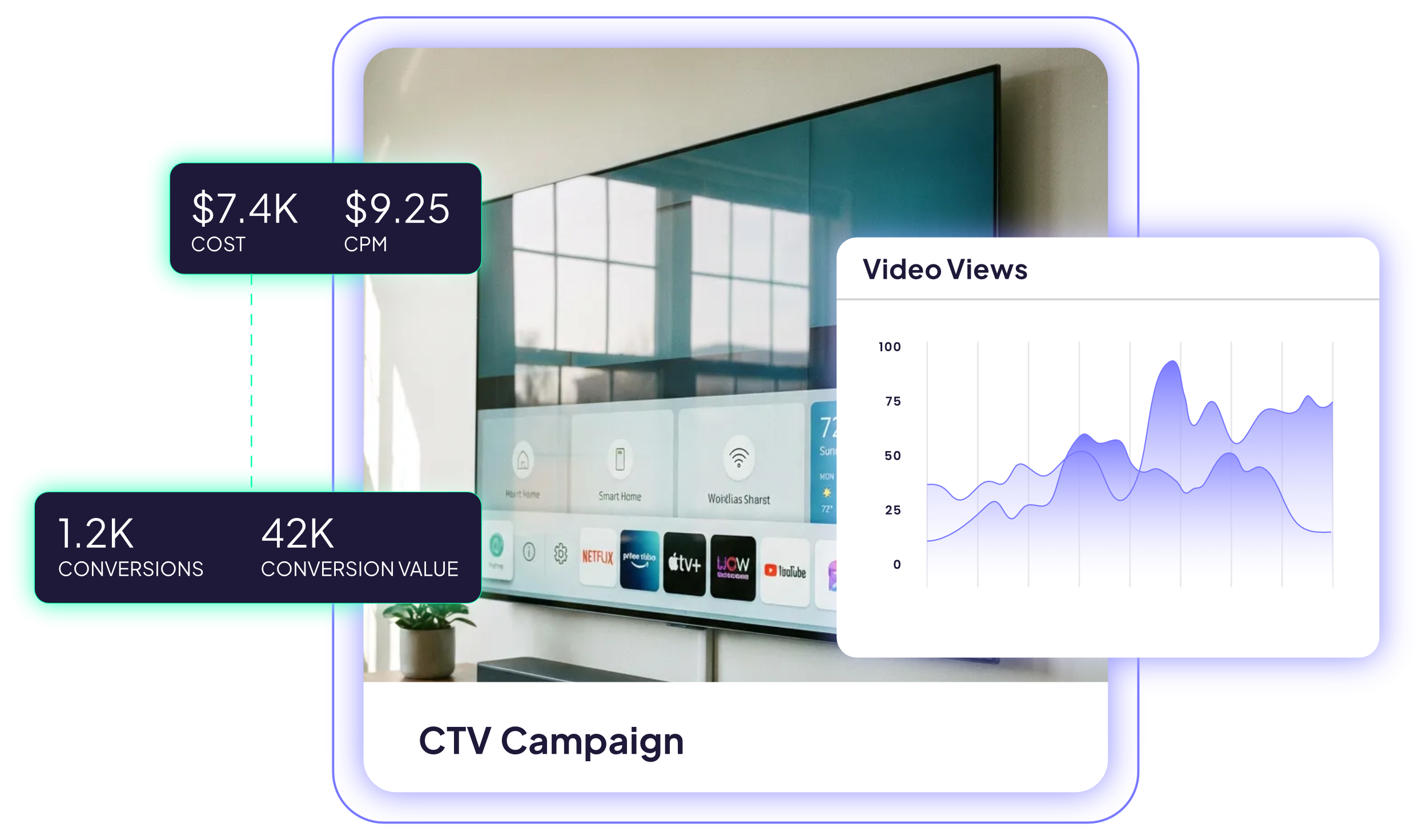 We use CTV to drive top-funnel awareness, then reinforce that exposure with paid search, social, and display to guide prospects toward conversion.